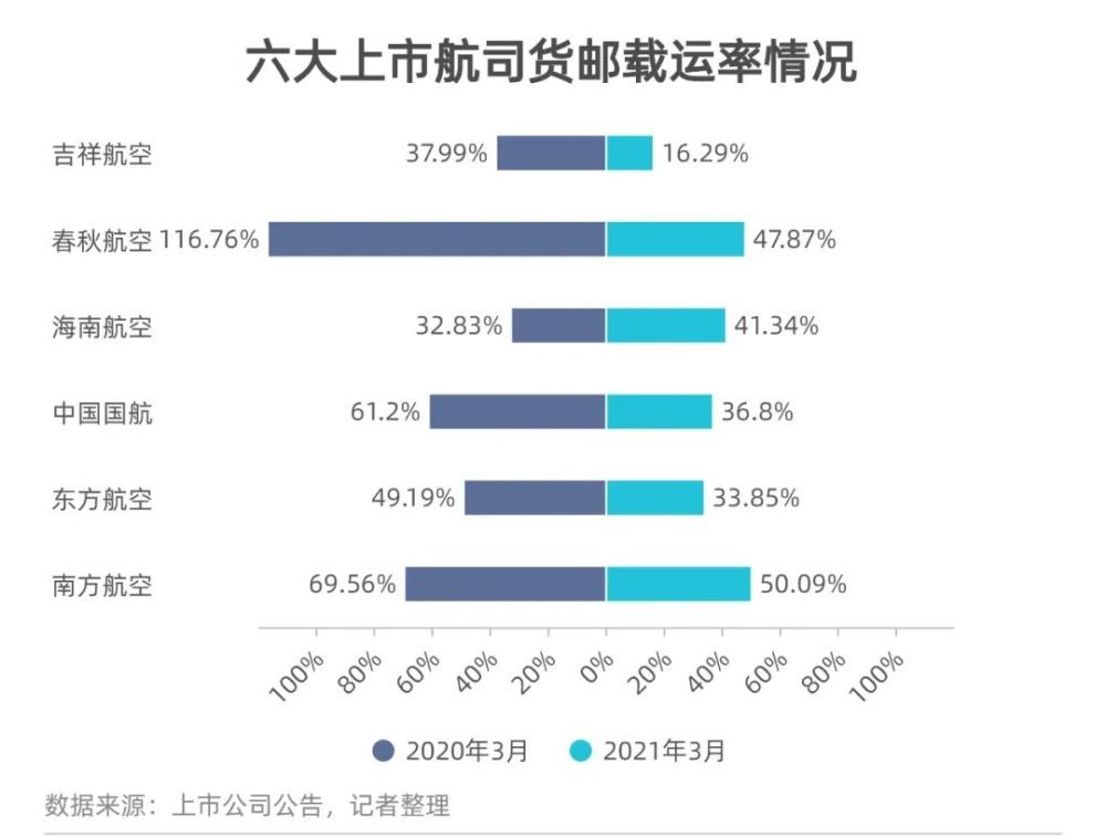 分航司來看,南方航空實現12.8萬噸的貨郵載運量,且貨郵載運率也最高,為50.09%,相當于投放的貨運運力中有一半得到了有效利用。